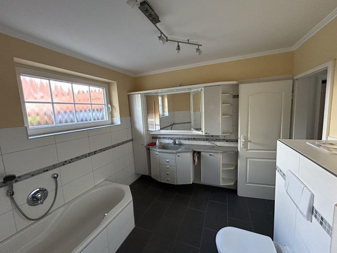 Das modernisierte Badezimmer überzeugt mit ebenerdiger Dusche und Badewanne, ergänzt durch ein separates Gästebad.
