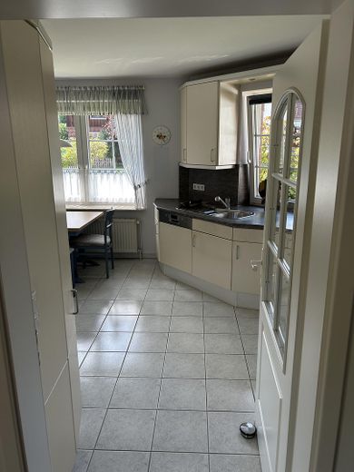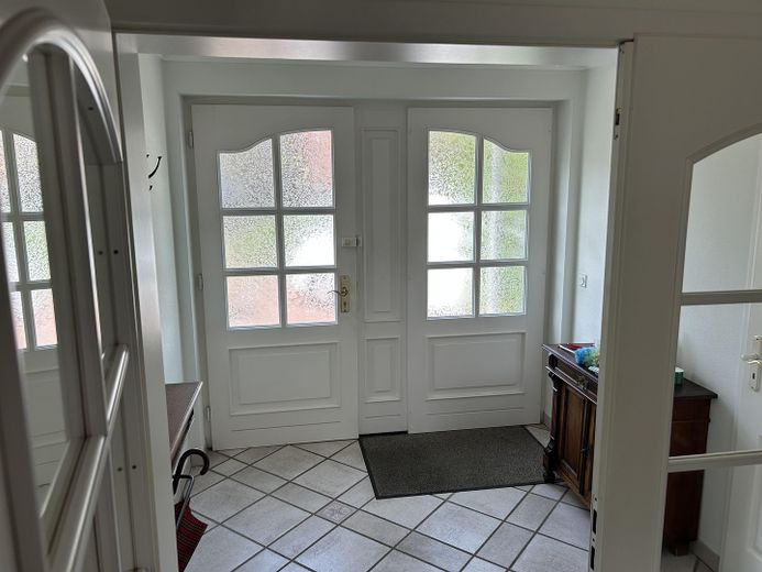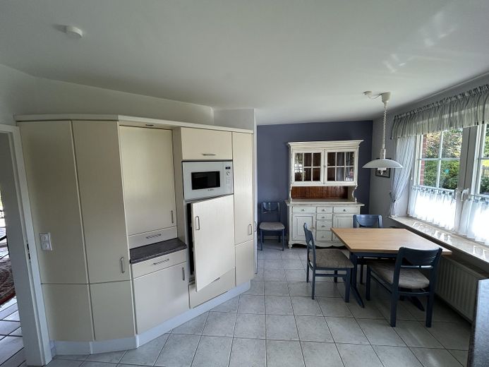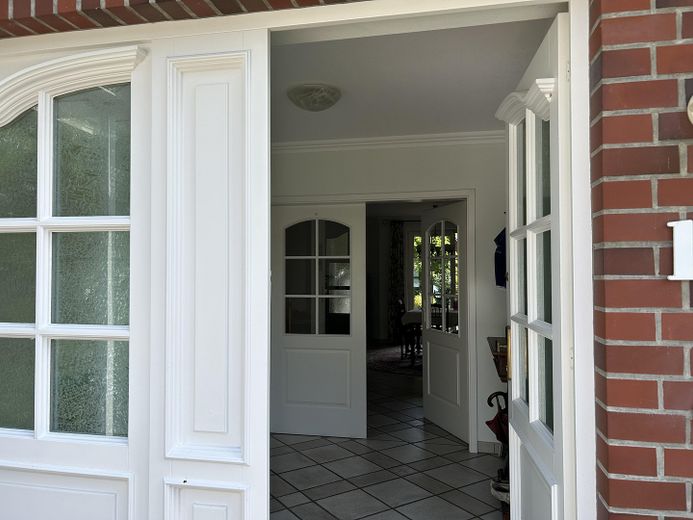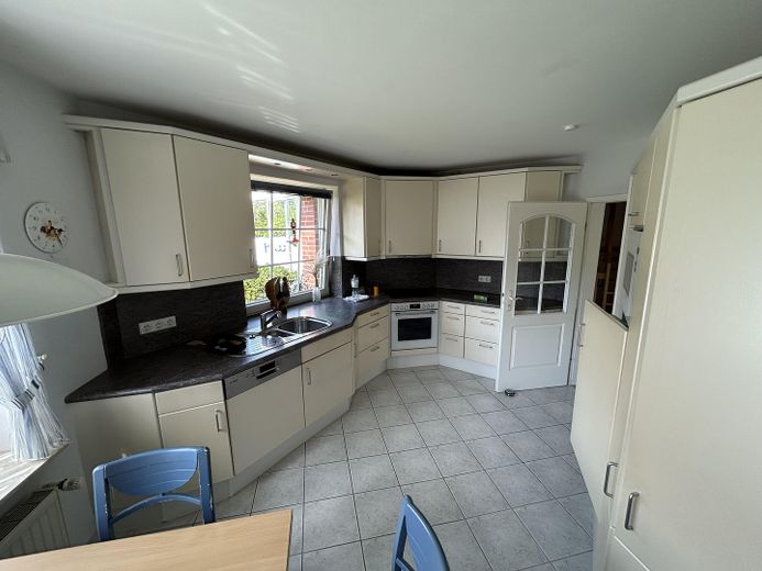 Die große Einbauküche mit erneuerten Bosch-Geräten lädt zum gemeinsamen Kochen und Verweilen ein und bietet Platz für einen Esstisch. Der einladende Flur mit Garderobe führt in die lichtdurchflutete Diele, die durch ihre Großzügigkeit und den weiten Blick in den Garten besticht – ideal für gesellige Runden und Familienfeiern.