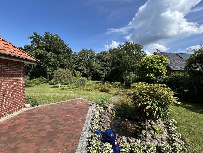 Der liebevoll angelegte Garten ist eine Oase der Ruhe: mit Terrasse, Bachlauf und Teich – ein perfekter Rückzugsort für Naturliebhaber.