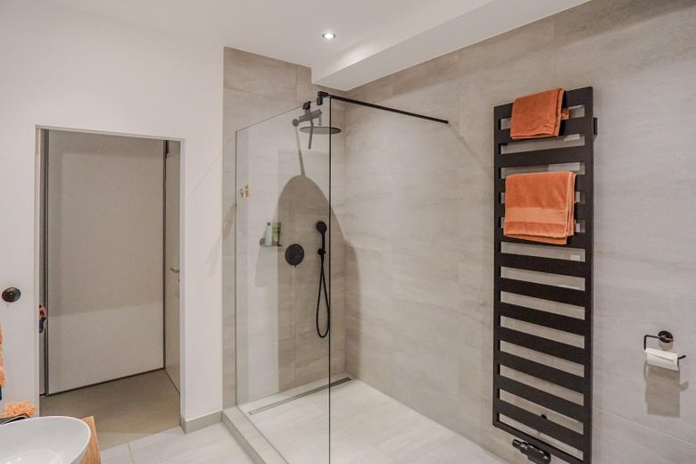 - Badezimmer (2023 renoviert) mit Walk-in-Regendusche, Badewanne und hochwertigen Fliesen
