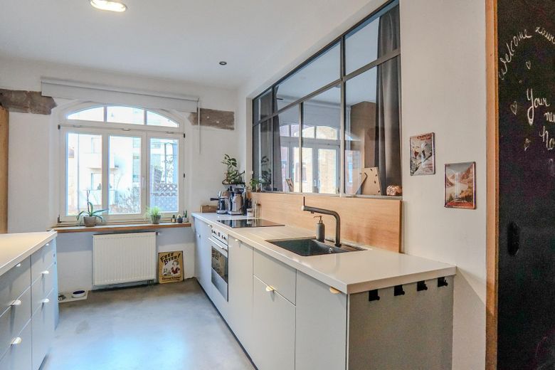Die moderne Einbauküche mit freistehendem Küchenblock ist im Kaufpreis enthalten.
