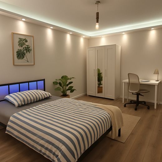 * Schlafzimmer mit einem 160 x 200 cm großen Bett, Schreibtisch mit Stuhl und Kleiderschrank