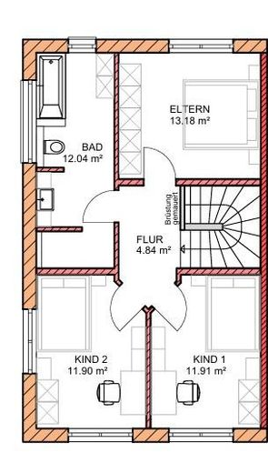 Im Obergeschoss befinden sich 3 Schlafzimmer und ein großes Bad. Ein offen gestalteter Eingangsbereich mit Garderobe und Gäste WC, eine Massivtreppe mit Naturstein belegt, sorgen beim betreten des Hauses für den besonderen Effekt.