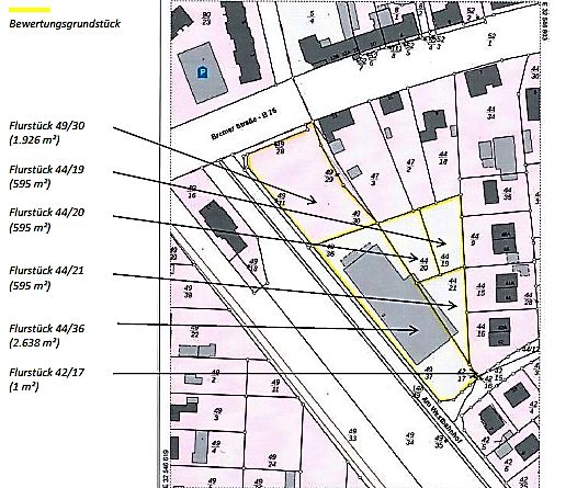 Kann lt. Bauamt auch zu ca. 12.000m² Wohnflächen (GRZ 0,4 + Anlehnung an die Nachbarbebauung) umgenutzt werden.