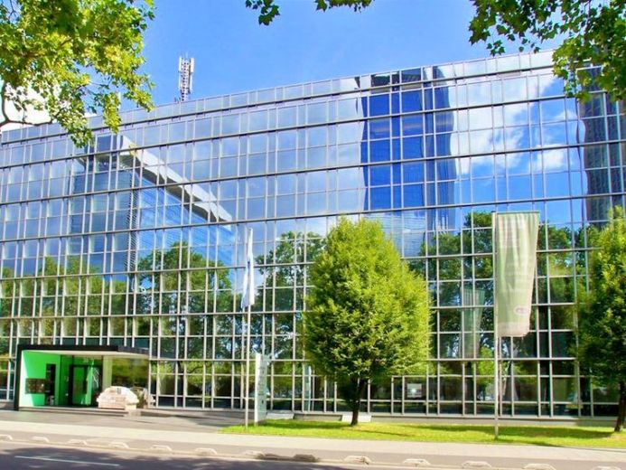 Das Bürogebäude wurde durch innovative Glas-Mosaik-Optik und eine neue Eingangsanlage grundlegend gestalterisch aufgewertet. Die Liegenschaft verfügt über einen repräsentativen Eingangsbereich mit dunklem Natursteinboden und farbig beschichtetem Glas als Wandbelag.