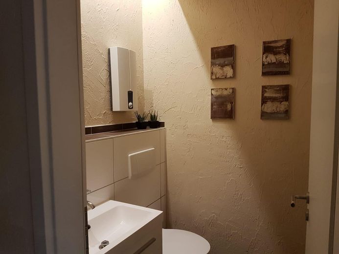 Es gibt eine Küche mit Kochinsel, 1 Bad, 1 Gäste-WC, 1 Abstellraum, 2 Schlafzimmer.