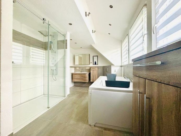 Im Dachgeschoss erwarten Sie ein großzügiges Schlafzimmer mit Ankleidebereich und ein modernisiertes Tageslichtbad, ausgestattet mit begehbarer Dusche und Whirlpool-Badewanne – Ihr privater Wellnessbereich. Das helle Dachstudio bietet zusätzliche Flexibilität, ob als Kinderzimmer, Homeoffice oder Rückzugsort.