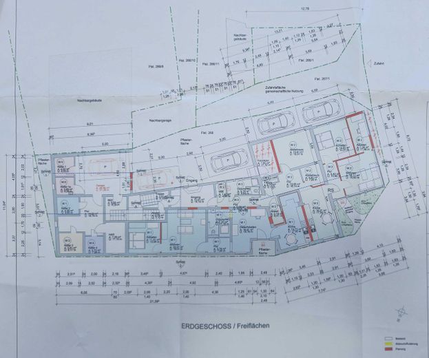 Die Wohnfläche beträgt 441 qm und ist aufgeteilt in Wohneinheiten zu 76,69 qm, 106,5 qm, 71,28 qm, 55,0 qm und 74,2 + 57,5 qm. Die Nutzflächen (Keller- und Abstellflöchen) betragen 96,9 qm. Das Obejekt hat eine Garage (26 qm) und vier Pkw-Stellplätze auf dem 507 qm großen Grundstück.