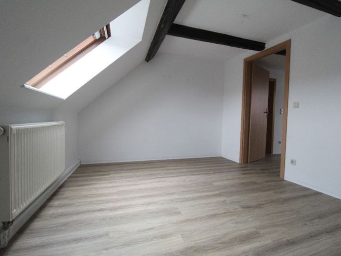 Diese helle Dachgeschosswohnung befindet sich in einem denkmalgeschützten Mehrfamilienhaus im Zentrum von Penig. Neben einer zweckmäßigen Küche verfügt sie über ein gefliestes Tageslichtbad mit Wanne. Im Bad befindet sich auch der Anschluss für die Waschmaschine. Vom Wohnzimmer aus gelangt man in das geräumige vormalige Kinderzimmer. Ebenso erreicht man über die innenliegende Holztreppe die obere Ebene, die mit Dachflächenfenstern aufwarten kann. Im Wohn- und Kinderzimmer befinden sich jeweils Sichtbalken, welche die Räume gemütlicher machen. Die Wohnung verfügt über eine Gegensprechanlage und eine eigene Etagenheizung. Der Mieter zahlt die Heizkosten je nach Verbrauch direkt an den Anbieter.