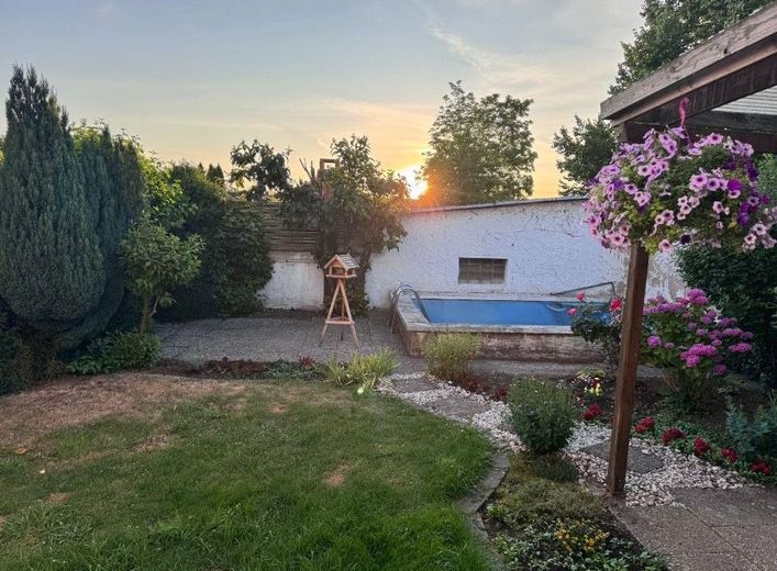 Hinter dem Haus eröffnet sich ein liebevoll angelegter Garten mit Rasenfläche, gemütlichen Rückzugsort und einem einladenden Pool – perfekt für entspannte Sommerabende.