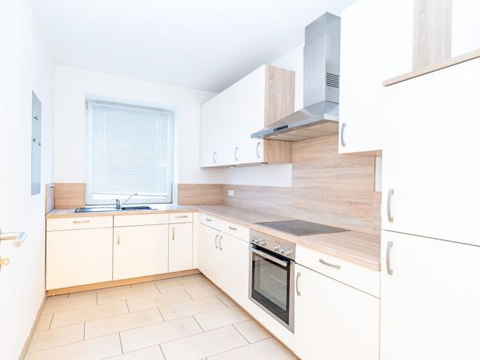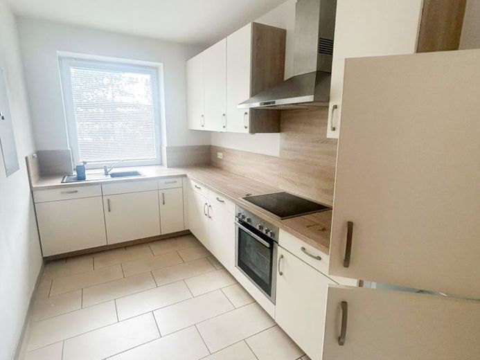Die geräumige L-förmige Küche besticht durch Cremefronten und moderne Einbaugeräte. Sie bietet viel Stauraum und ausreichend Platz zum Kochen und Vorbereiten. Der Boden ist mit hellen Fliesen ausgestattet, die das freundliche und einladende Gesamtbild abrunden. Das Wohnzimmer ist großzügig geschnitten, lichtdurchflutet und wird über die Fußbodenheizung in allen Wohnbereichen angenehm temperiert – so genießen Sie selbst an kühleren Tagen eine behagliche Atmosphäre.