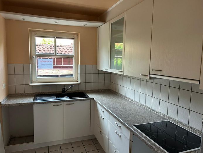 Erdgeschoss: Eingangsbereich, Duschbad, Küche mit Einbauküche, sonniges Wohnzimmer mit Terrassenzugang