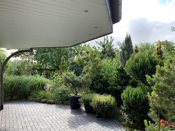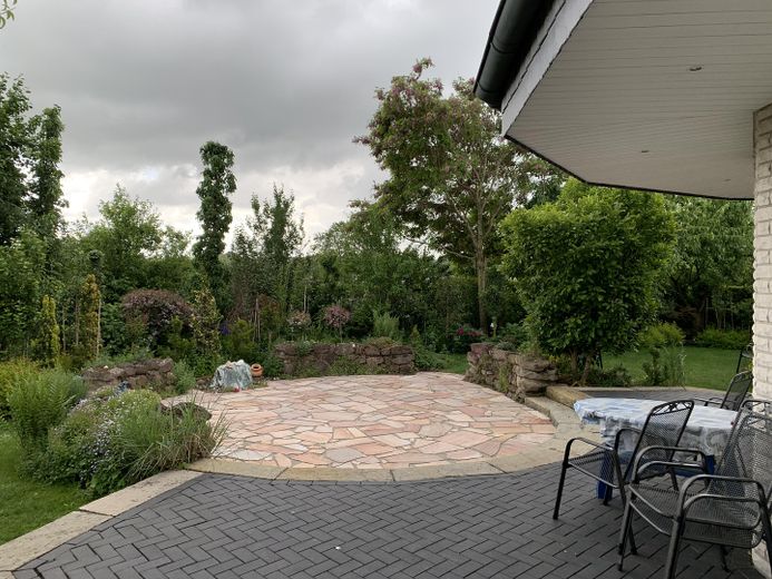 Das Grundstück ist 1.178 m² groß. Davon entfallen ca. 172 m² Grundfläche auf das Haus und ca. 52 m² auf die Garage. Die Einfahrt mit ca. 92 m² sowie die Süd-, Ost- und Nordterrasse mit insgesamt ca. 130 m² sind mit gebrannten Pflastersteinen geklinkert. Der Zugang zum Haus erfolgt über 2 separate, mit anspruchsvollen Gaubenpilzen überdachte großzügige Eingänge. Die weiten Dachüberstände 1,20 m ums Haus herum und 2,00 m unter dem Wintergarten, der Südgaube und den Eingängen ermöglichen ein trockenes und schattiges Verweilen. Die Ostterrasse erstreckt sich vor dem Erker des Wohn- / Essbereiches bzw. darüber liegendem Wintergarten. Sie wird um einen Steinkreis von 48 m² erweitert, davor und rund herum befindet sich ein baum- und strauchreicher Garten.