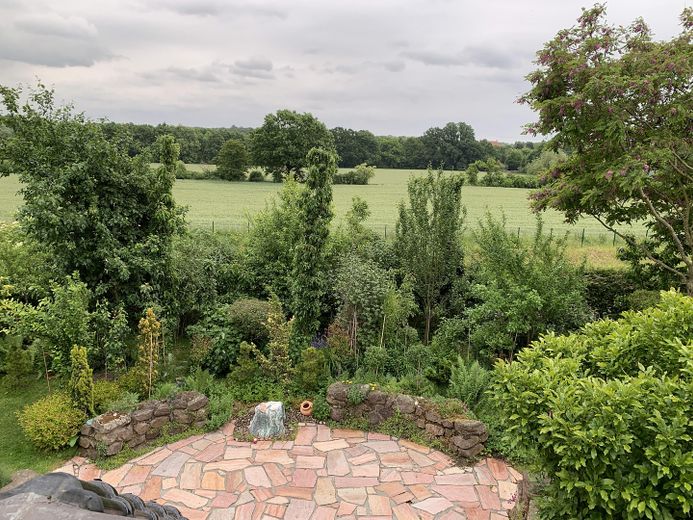Der Garten ist weitgehend nicht einsehbar bepflanzt, enthält eine Vielzahl an besonderen Obst- und Ziergehölzen und ermöglicht Ruhe und Entspannung und die Privatsphäre, die man sich fürs eigene Zuhause wünscht.