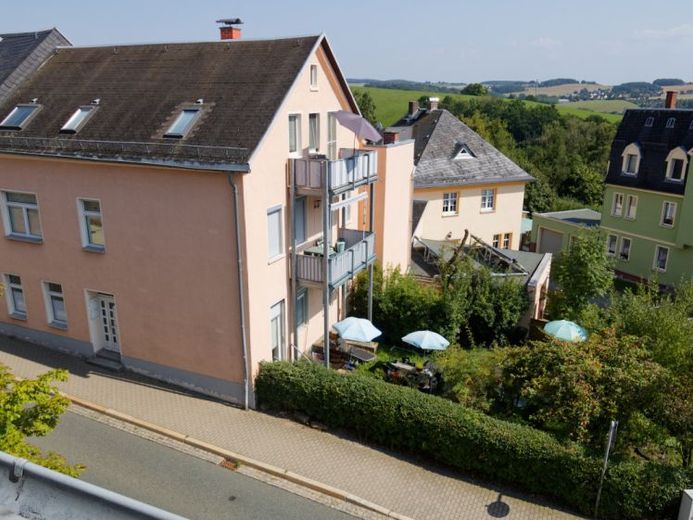 Im Obergeschoss befindet sich eine seit 1994 vermietete Etagenwohnung mit 4 Zimmern, Küche, Bad/WC, Flur und Balkon. Dieser Wohnung zugeordnet sind Staufläche und eine die Garage im Nebengebäude.