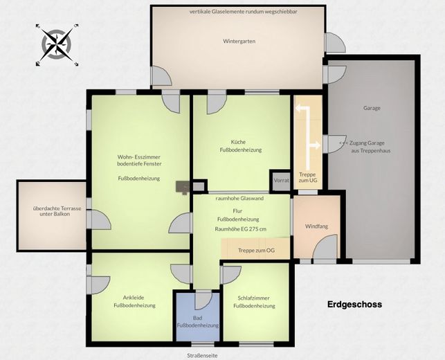 •Zugang zum UG: Nach Betreten des Windfangs im Erdgeschoss gelangt man über eine Treppe unmittelbar in das UG. Die Räume des EG werden dabei nicht betreten, so dass die UG-Räumlichkeiten auch als eigenständige Wohnung gestaltet werden können. Strom- und Wasseranschlüsse sind für eine etwaige einzubauende Küche über den zentral gelegenen HAR (Hausanschlussraum) problemlos möglich.