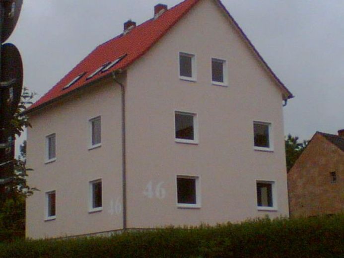 Eine attraktive und schön zugeschnittene Etagenwohnung (2.OG) mit Tageslichtbad+Dusche und Küche mit Fenster in Dreifamilienhaus im Grünen nahe der Dualen Hochschule Gera-Eisenach (ca. 2 km) zu vermieten. Die große Wohnküche ist mit Einbauküche und kleinem Wandschrank/Speisekammer ausgestattet. Die Dunstabzugshaube hat Abluft-Anschluß an die Dachentlüftung. Die EBK besteht aus einem E-Herd mit Ceranfeld und Backofen, einer Dunstabzugshaube, einem Einbauspülbecken, einem Kühlschrank mit Viersterne-Gefrierfach. Die Möbelfronten der EBK sind braun. Es gibt für Geschirrspüler, Waschmaschine und Wäschetrockner genug Stellfläche in der Küche. Das Wohnzimmer hat 3 Fenster und eine Kaminofenvorbereitung. Auch genügend Stellfläche für Festbrennstoffe wie Brennholz oder Briketts ist im Nebengelass vorhanden. Im Schlafzimmer haben die derzeitigen Mieter eine Zwischenwand aufgestellt so dass es unter der Dachschräge einen begehbaren Kleiderschrank gibt. Eine Abstellkammer auf halber Treppe und ein Kellerabteil gehören auch zur Wohnung. Die lichtdurchfluteten Räume sind alle zentral über den Flur begehbar. Der Bodenbelag ist im Wohn-, im Schlaf- und im Kinderzimmer Laminat, im Flur und der Küche Linoleumbelag und im Bad sind Bodenfliesen. Eine Ölzentralheizung befindet sich im Objekt und digitale Langzeit-Heizungssteuerung dieser Wohnung im Flur. Das Warmwasser ist über Durchlauferhitzer in Bad und Küche erhältlich. Jeder Wohnung ist ein PKW-Stellplatz für mtl. 10,00€ auf dem Grundstück zugeordnet, welcher aber nicht unbedingt angemietet werden muss. Fahrräder könnten in einen dafür vorgesehenen Raum im Schuppen untergestellt werden. Hervorzuheben ist sie kostenfreie Gartennutzung ( eines größeren mittleren eingezäuntes Gartenstück mit 2 Terrassen, eine davon überdacht (sehr schick), hinter dem Wohngebäude). Ca. 63,44m² sind bei dieser Wohnung die Grundfläche, nicht die Wohnfläche, die Wohnfläche sind ca. 57 m². Die Kaltmiete bezieht sich allerdings nicht auf die Quadratmeter pro Wohnfläche, sondern nur auf die Wohnung insgesamt.). Im Jahr 2009 im Zuge der Haussanierung wurde auch die Ölzentralheizung im Kellergeschoß eingebaut. Im Gebäude gibt es nur 3 Etagenwohnungen. Im 1. Obergeschoß wohnt die Hausmeisterin dieses Objektes. Sie erledigt die Straßenreinigung und den Winterdienst sowie die Vorgartenpflege. Der Energieverbrauch für Warmwasser ist nicht enthalten. Das Gebäude wurde im Jahr 1935 erbaut. Mietkaution: 3 Nettokaltmieten (gesamt: 1050,00€). Kleintiere oder auch eine Katze sind vom Vermieter gestattet.