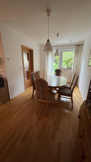 Lounge-, Essbereich mit Zugang zur Terasse mit kleinem Garten an der Hausrückseite