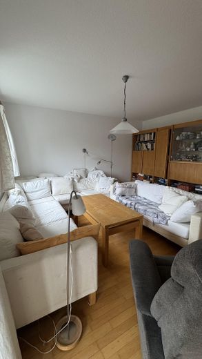 helles großzügiges Wohnzimmer mit Kamin und Südbalkon