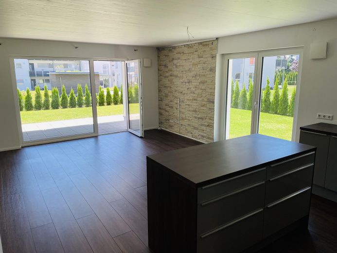 Der offene Wohn- und Essbereich überzeugt durch bodentiefe Fenster, die viel Licht hereinlassen, und den direkten Zugang zur großen Terrasse mit Garten.