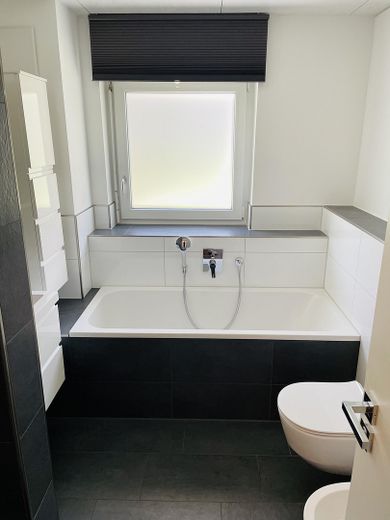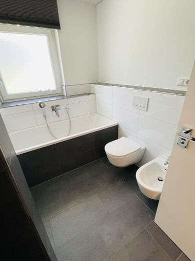 Das Badezimmer ist mit hochwertigen Materialien, einer Badewanne, einer separaten Duschekabine sowie einem Bidet ausgestattet.