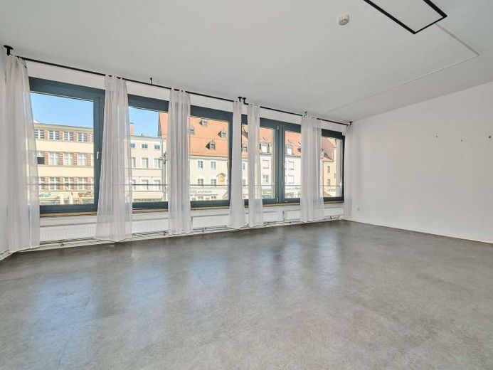 Die großzügige Fensterfront zur Platzseite sorgt für eine sehr gute Tageslichtversorgung und eine angenehme Arbeitsatmosphäre. Die Räume sind mit einem robusten, pflegeleichten Bodenbelag in neutralem Grauton ausgestattet und verfügen über eine moderne, energiesparende Deckenbeleuchtung. Die bestehende Raumstruktur lässt sich flexibel unterteilen oder offen gestalten, ideal für individuelle Konzepte.