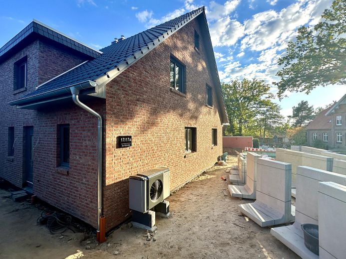Die Doppelhaushälfte wird schlüsselfertig übergeben – inklusive Terrasse, Gartenanlage und vollständig hergestellten Außenanlagen. Für effizientes und umweltfreundliches Heizen sorgt eine moderne Luftwärmepumpe der Marke Wolf.