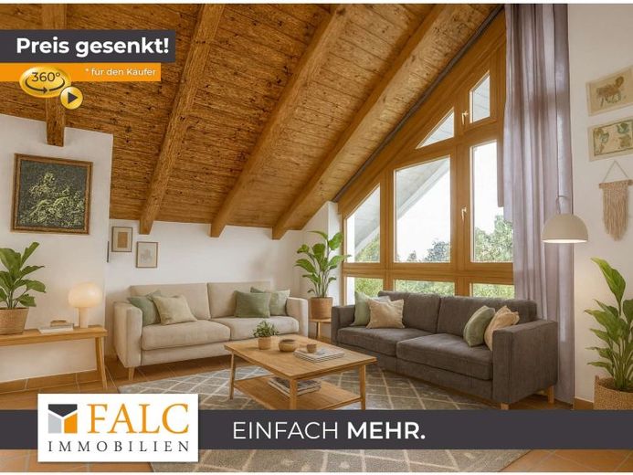 Über eine elegante Holztreppe führt der Weg ins lichtdurchflutete Obergeschoss. Hier öffnet sich ein großzügiger Wohn- und Essbereich mit markanter Holzbalkendecke und herrlicher Weitsicht. Die Dachterrasse ist vollständig uneinsehbar und bietet einen geschützten Platz für entspannte Stunden im Freien – ein echtes Highlight mit Wohlfühlfaktor.