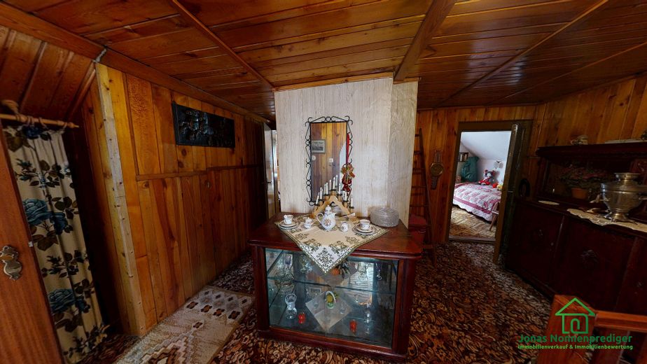 Das Haus ist in massiver Bauweise errichtet und verfügt über ein Satteldach mit Betondachsteinen sowie einen Teilkeller. Die Raumaufteilung ist klassisch und funktional. Im Erdgeschoss erwartet Sie unter anderem ein Wohnzimmer, eine separate Küche mit vorhandener Einbauküche sowie ein Badezimmer mit Badewanne. Die Innenausstattung entspricht überwiegend dem Stand der 90er Jahre bzw. dem Ursprungsbaujahr – eine umfassende Sanierung ist einzuplanen.