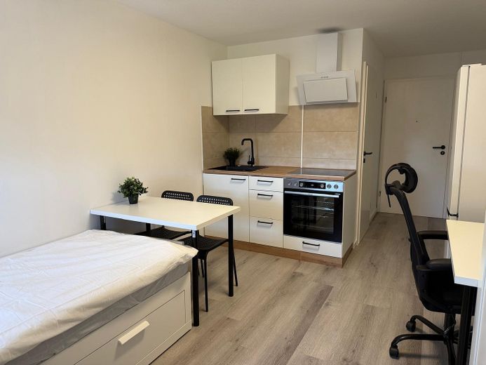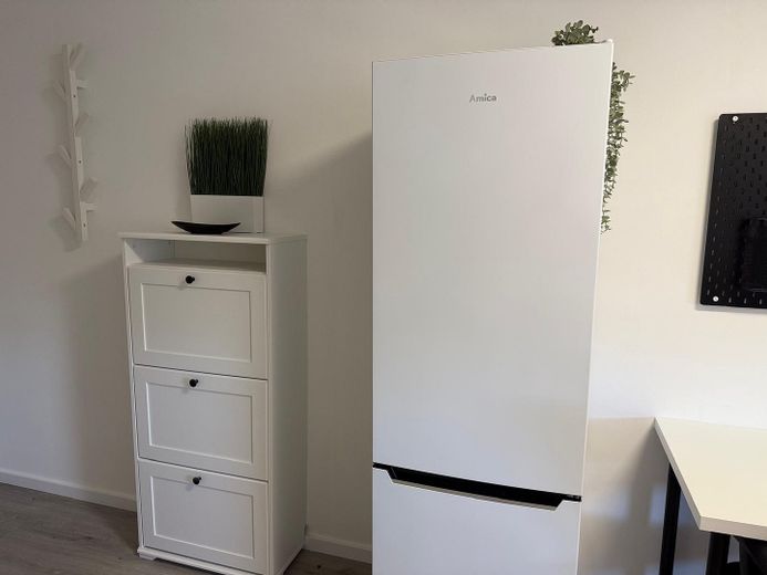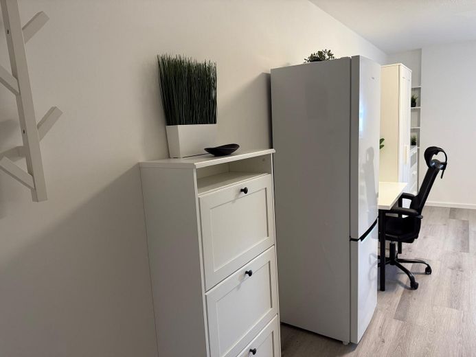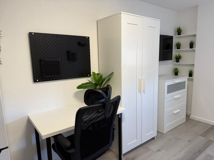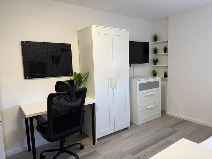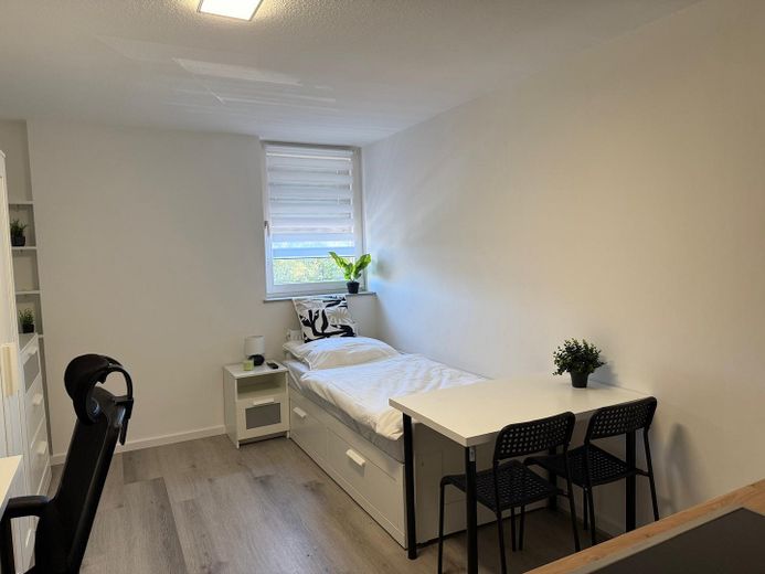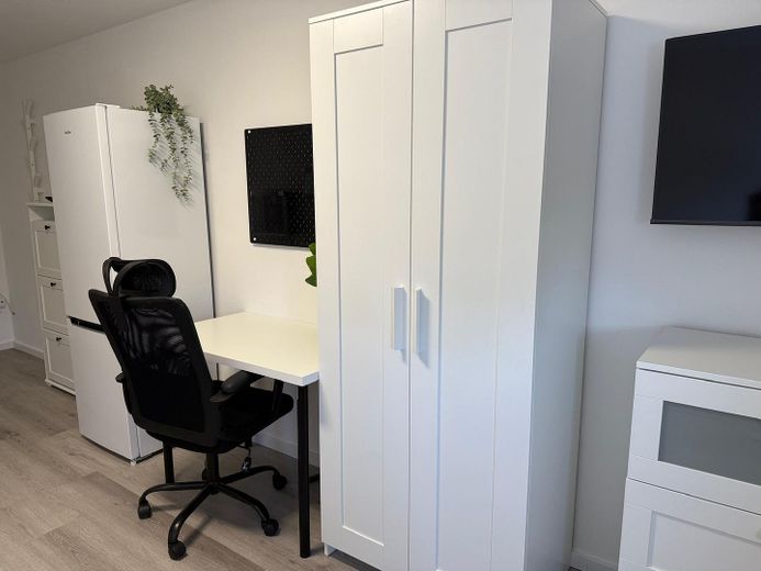 Vollmöbliert mit allen notwendigen Möbeln (Bett mit Stauraum, Schreibtisch, Stuhl, Esstisch mit Stühlen, Kleiderschrank, Regale)