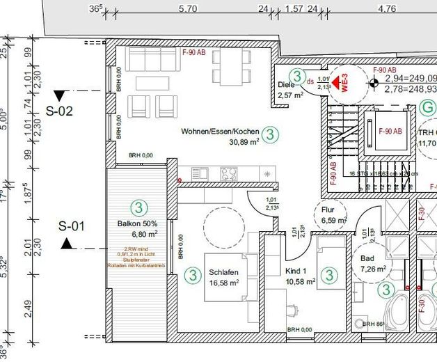 Die Zimmer teilen sich wie folgt auf: ein großes Wohn- Esszimmer, welches einen Zugang zu einem geräumigen und sonnigen Balkon bietet, ein Schlafzimmer, welches ebenfalls an den Balkon angebunden ist und ein Kinder- bzw. Bürozimmer. Weiterhin bietet die Wohnung einen großzügigen Flur und ein Bad mit einer begehbaren stufenlosen Dusche und einer edlen Glasabtrennung. Das Badezimmer ist weitestgehend fertiggestellt: die Wände sind gefliest (Dusche deckenhoch, Rest - 1,20m), die restlichen Wände sind mit einem edlen Klimascheibenputz verarbeitet und bereits angestrichen.