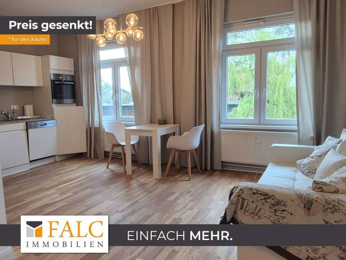 Auf 43 m² Wohnfläche befindet sich im Wohnraum ein modern gestalteter Kücheneinbau mit hochwertigen Elektrogeräten und einer Eichenholzarbeitsplatte. Die Räume sind mit Echtholzparkett und im Badezimmer mit Fliesen ausgelegt. Das Bad ist mit einer Eckdusche und stilvollen Fliesen modern gestaltet.