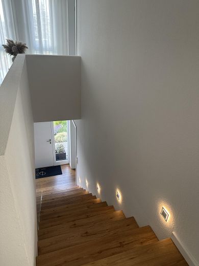 Im gesamten Haus sorgen dimm- und programmierbare Deckenspots für stimmungsvolle Beleuchtung. Am Treppenaufgang setzen elegante Spots dezente Akzente und schaffen abends eine besonders gemütliche Stimmung. Auch die Außenbeleuchtung ist dimmbar und farblich einstellbar – durch Philips Hue-Technik lässt sich alles bequem per App steuern.