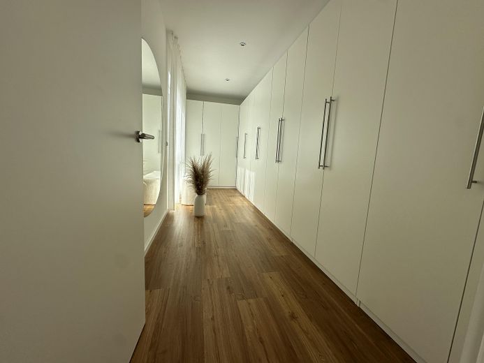 Das Schlafzimmer verfügt über einen direkten Zugang zur Ankleide, die – ebenso wie die Einbauküche, der Hauswirtschaftsraum und die Badezimmer – mit maßgefertigten Einbaumöbeln ausgestattet ist. Alle genannten Möbel bleiben im Haus und sind im Kaufpreis enthalten.