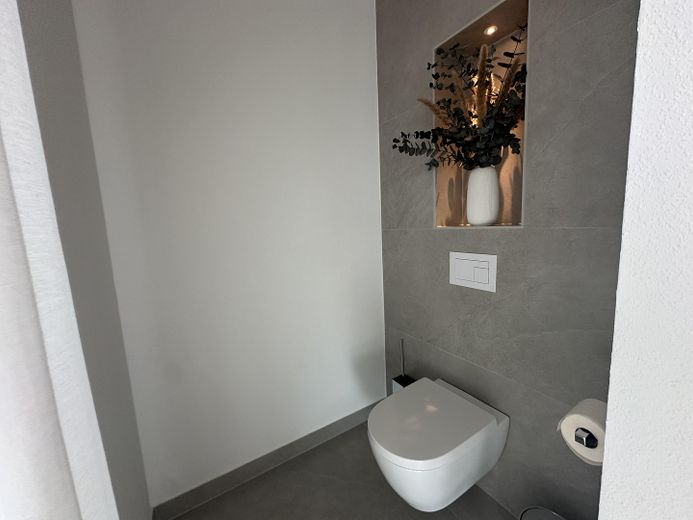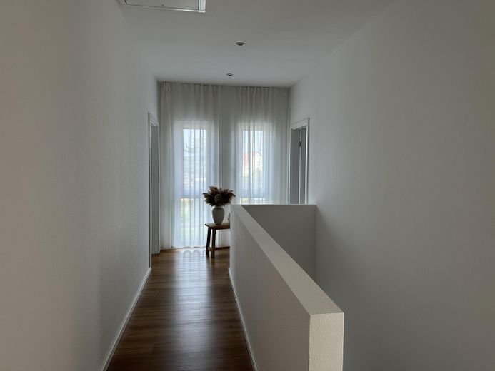 Das Haus überzeugt durch modernste Smart-Home-Technologie, die den Alltag komfortabel und sicher gestaltet. Sämtliche Rollläden lassen sich bequem per App steuern, und auch die Raffstores im Wohn-, Ess- und Küchenbereich bieten eine flexible Lichtsteuerung durch individuell einstellbare Lamellen. Für Sicherheit sorgen Kameras auf allen vier Hausseiten, die optional mit Alarmfunktion betrieben werden können. Zusätzlich ist das Haus mit einer Gegensprechanlage ausgestattet, sodass Besucher komfortabel vor dem Einlass identifiziert werden können. Die gesamte Innen- und Außenbeleuchtung, einschließlich der dimmbaren Philips Hue-Deckenspots, lässt sich bequem per App steuern. Zusätzlich sind bereits Vorrichtungen für eine Photovoltaikanlage auf dem Dachboden vorbereitet.
