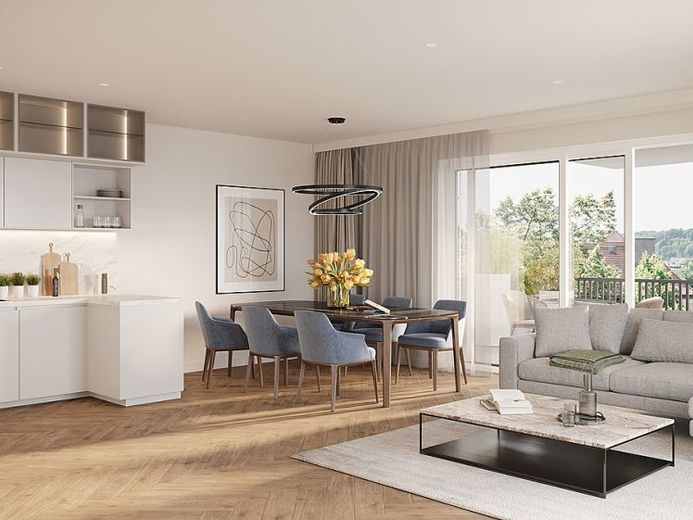 Die barrierefreie Vier-Zimmer-Wohnung im Obergeschoss überzeugt durch ihren durchdachten Grundriss und ihren sonnigen, teilüberdachten Süd-West-Balkon. Großzügige Raumhöhen und bodentiefe Fenster sorgen für viel Licht und ein modernes Wohnambiente.