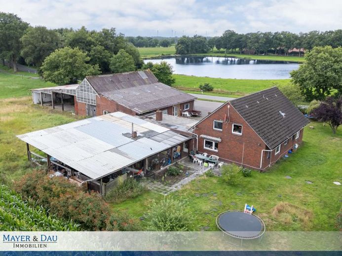 In idyllischer Lage im Außenbereich der Gemeinde Apen, im Landkreis Westerstede, befindet sich dieses weitläufige Anwesen bestehend aus zwei separaten Wohnhäusern mit insgesamt vier Wohneinheiten. Das im Jahr 1983 errichtete Objekt liegt auf einem großzügigen Grundstück von ca. 3.552 m² und bietet mit einer Gesamtwohnfläche von ca. 331 m² sowie insgesamt 11 Zimmern vielfältige Nutzungsmöglichkeiten laut Baugenehmigung – ideal für Mehrgenerationenwohnen, Wohnen und Arbeiten unter einem Dach oder zur (Teil-)Vermietung.