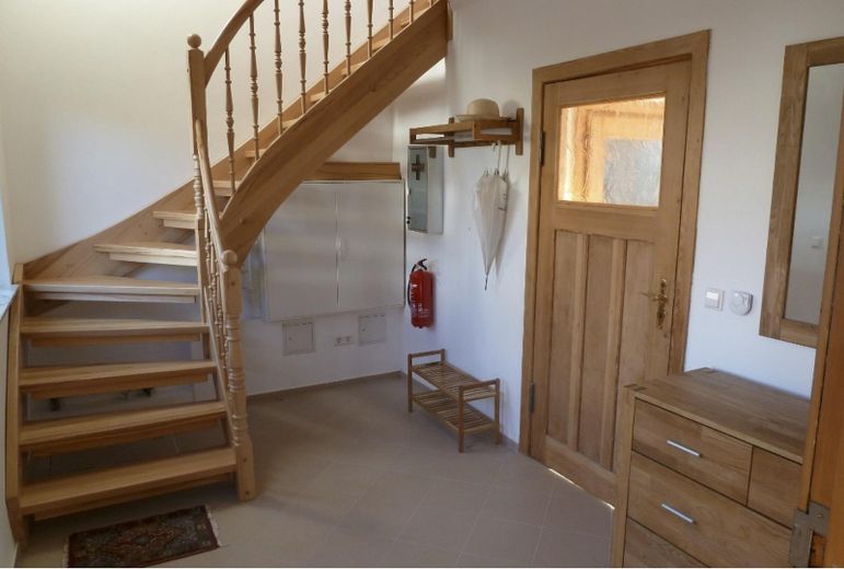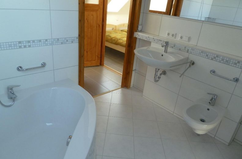 Obergeschoß mit hohem Trempel: 1 großer offener Flur (Arbeitsbereich, Spielen) mit trempelhoher Zeile von Einbauschränken; 1 Wannen-/ Bidetbad mit Glasregalen und Ablagefläche; 1 Schlafzimmer mit 2 Kieferholzeinzelbetten/ Doppelbett mit Lattenrost, Matrazen, Nachtschränke und große Kommode aus massivem Kiefernholz; offener Flur mit trempelhoher Zeile von Einbauschränken; SAT- und Netzwerkanschlüsse, großzügige Steckdosenverteilung.