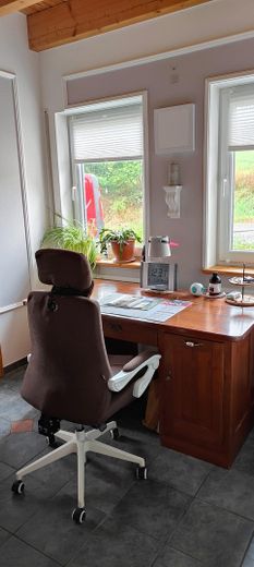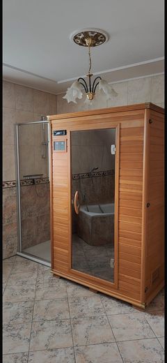 Im Obergeschoss erwarten Sie ein behagliches Schlafzimmer mit Ankleide, ein Arbeits- oder Kinderzimmer, ein weiteres Gästezimmer, ein praktischer Hauswirtschaftsraum sowie ein Wellness-Badezimmer mit Eckbadewanne, Infrarotkabine und Dusche – ein Ort zum Entspannen und Abschalten.