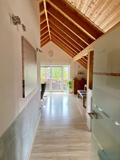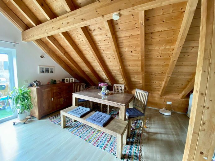 Diese lichtdurchflutete 3 Zi Nichtraucherwohnung überzeugt durch ihre offene Architektur mit sichtbaren Holzbalken und über 3,5 m hohen Decken, die ein außergewöhnlich großzügiges Raumgefühl schaffen. Große, dreifach verglaste Fenster sorgen für ein helles, freundliches Ambiente.