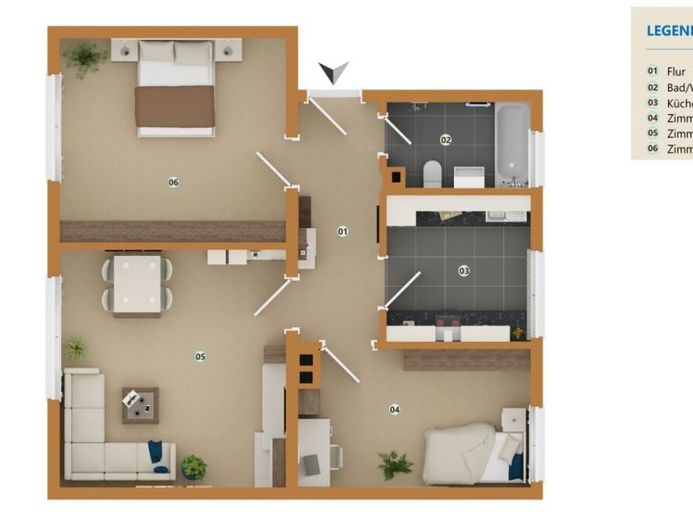 Das Wohnzimmer ist der größte Raum der Wohnung. Der Boden ist mit einem Teppichboden in einem warmen Farbton ausgelegt.