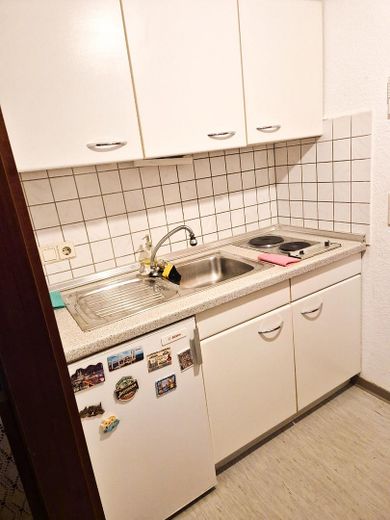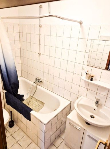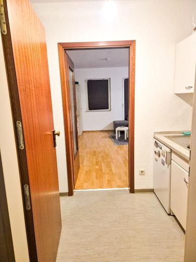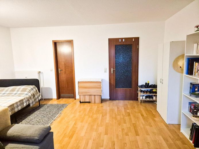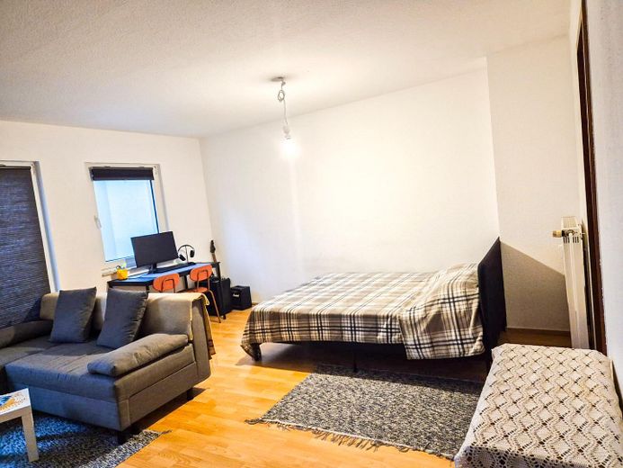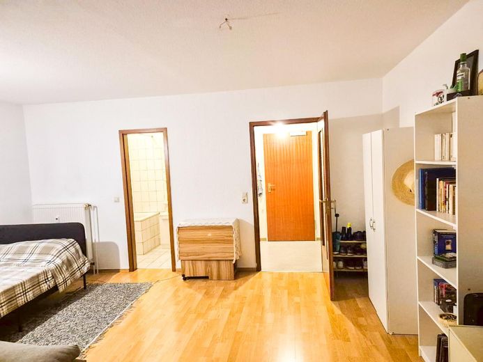 Die Wohnung ist hell, gepflegt und praktisch geschnitten. Der Wohnraum bietet Platz zum Wohnen, Schlafen und Arbeiten. Die Küche ist mit einer Einbauzeile ausgestattet, das Bad verfügt über eine Badewanne. Ein Außenstellplatz und ein eigener Kellerraum gehören ebenfalls zur Wohnung. Auf Wunsch kann sie vor Einzug renoviert werden.