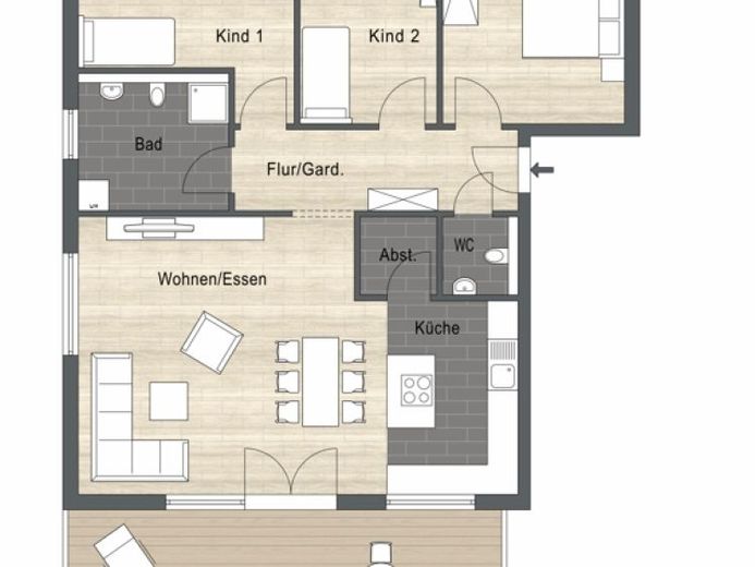 Die andere Hälfte der Wohnung begeistert Sie mit dem offenen Wohn-/Esszimmer und der integrierten Küche. Das Badezimmer mit Tageslicht wird nach Ihren Wünschen gestaltet. Natürlich haben wir auch ein Gäste-WC sowie einen Abstellraum eingeplant. Es ist alles vorhanden für ein bequemes Wohnen.