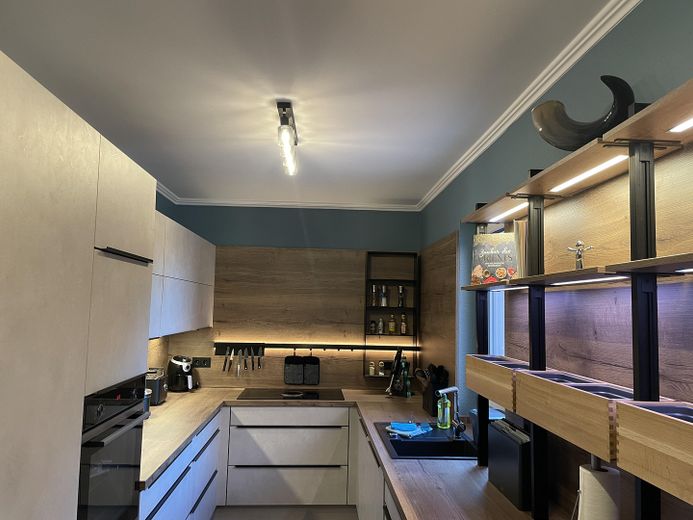 2 Schlafzimmer mit 2 Bäder, Gästetoilette, Waschraum, Ankleidezimmer, offene Wohnküche, Wohnzimmer, Empfangsdiele, 100 m²Terrasse, trockener Keller