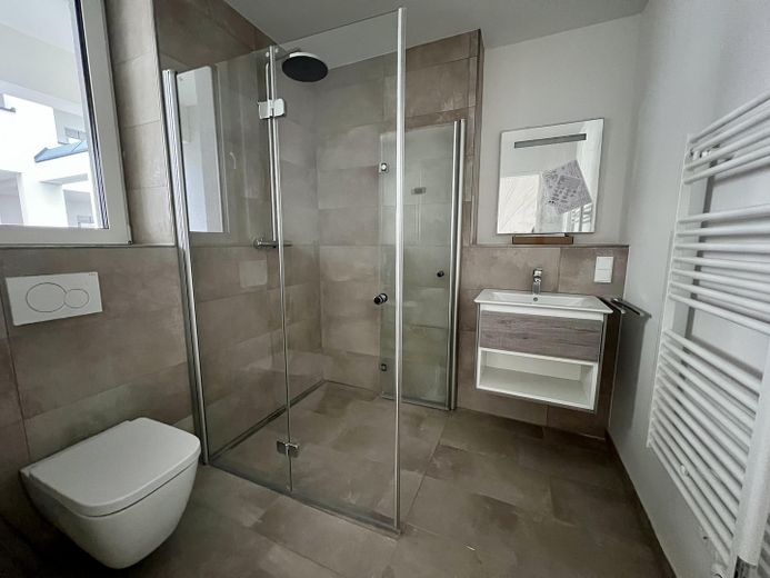 - stilvoll eingerichtetes Bad mit Dusche, WC und Waschtischunterschrank