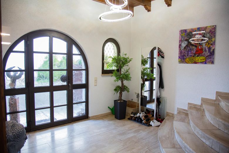 Der großzügige Eingangsbereich mit eleganter Treppe führt ins Obergeschoss. Auf dieser Ebene befinden sich außerdem ein praktischer Büroraum sowie das eindrucksvolle Kaminzimmer mit stilvollem Heizkamin und integrierter Hausbar. Von hier aus gelangen Sie direkt auf die sonnige Süd-West-Terrasse und in den liebevoll angelegten Garten .