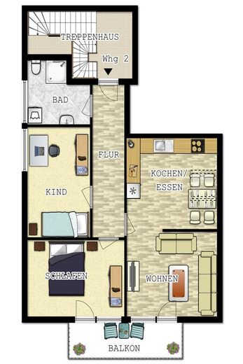 Eine helle Küche, ein offener Wohnbereich mit Übergang auf den sonnigen Balkon, laden zum gemütlichen verweilen mit Blick ins gepflegte Grüne ein.