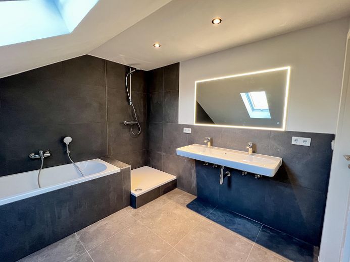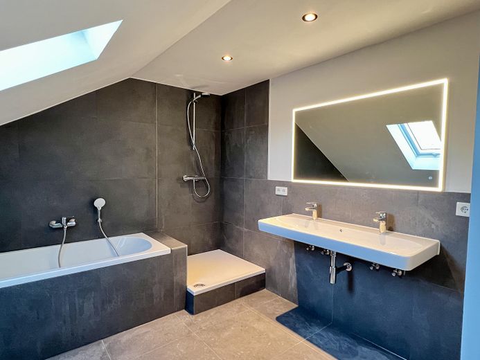 Das großzügige Bad verfügt über eine Badewanne, Dusche, Doppel-Waschtisch und Toilette. Anschlussmöglichkeit für Waschmaschine und Trockner im Bad sind vorhanden. Es wurden Armaturen des Herstellers Grohe verwendet.