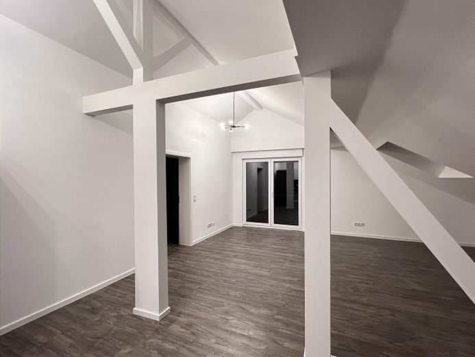 Moderne und stilvolle Dachgeschoss-Wohnung mit offener, hoher Decke und mit sichtbarer Balkenkonstruktion im Wohn- und Essbereich. Die Raumhöhe beträgt hier ca. 3,40m.