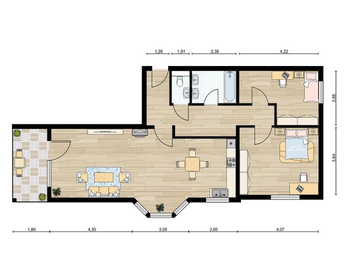 Die Wohnung verfügt über insgesamt 3,5 Zimmer, die flexibel als Schlaf-, Arbeits- oder Kinderzimmer genutzt werden können. Das Bad ist mit einem Doppelwaschbecken ausgestattet, ergänzt wird das Raumangebot durch ein separates WC.